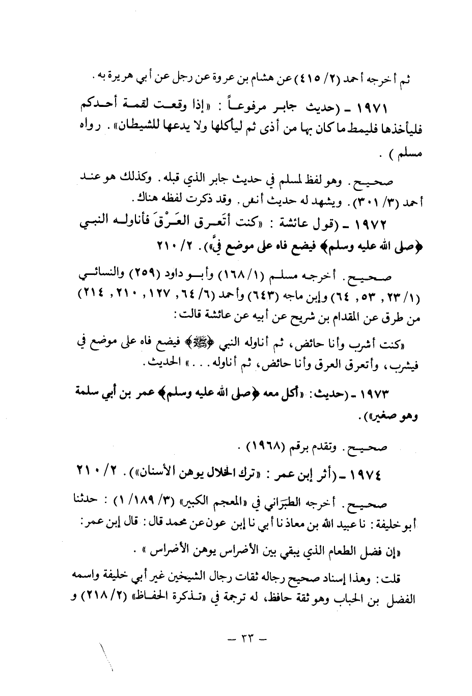 (1971) - (حديث جابر مرفوعا: " إذا وقعت لقمة أحدكم فليأخذها فليمط ما كان بها من أذى ثم ليأكلها ولا يدعها للشيطان " رواه مسلم.