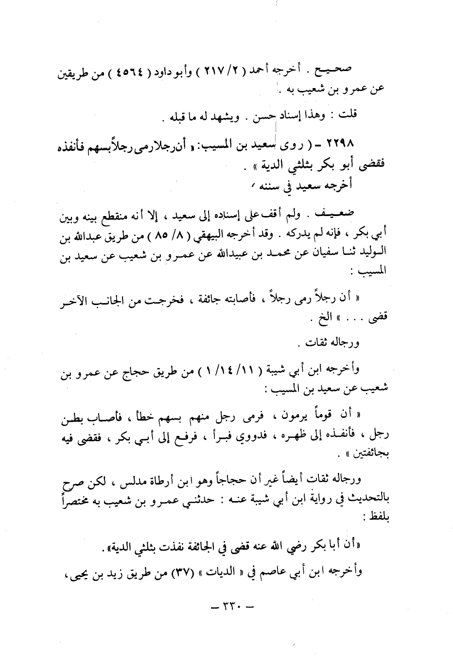 (2298) - (روى سعيد بن المسيب: " أن رجلا رمى رجلا بسهم فأنفذه فقضى أبو بكر بثلثى الدية " أخرجه سعيد فى سننه.