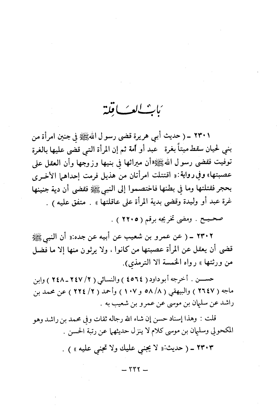 (2302) - (عن عمرو بن شعيب عن أبيه عن جده: " أن النبى صلى الله عليه وسلم قضى أن يعقل عن المرأة عصبتها من كانوا , ولا يرثون منها إلا ما فضل من ورثتها " رواه الخمسة إلا الترمذى.
