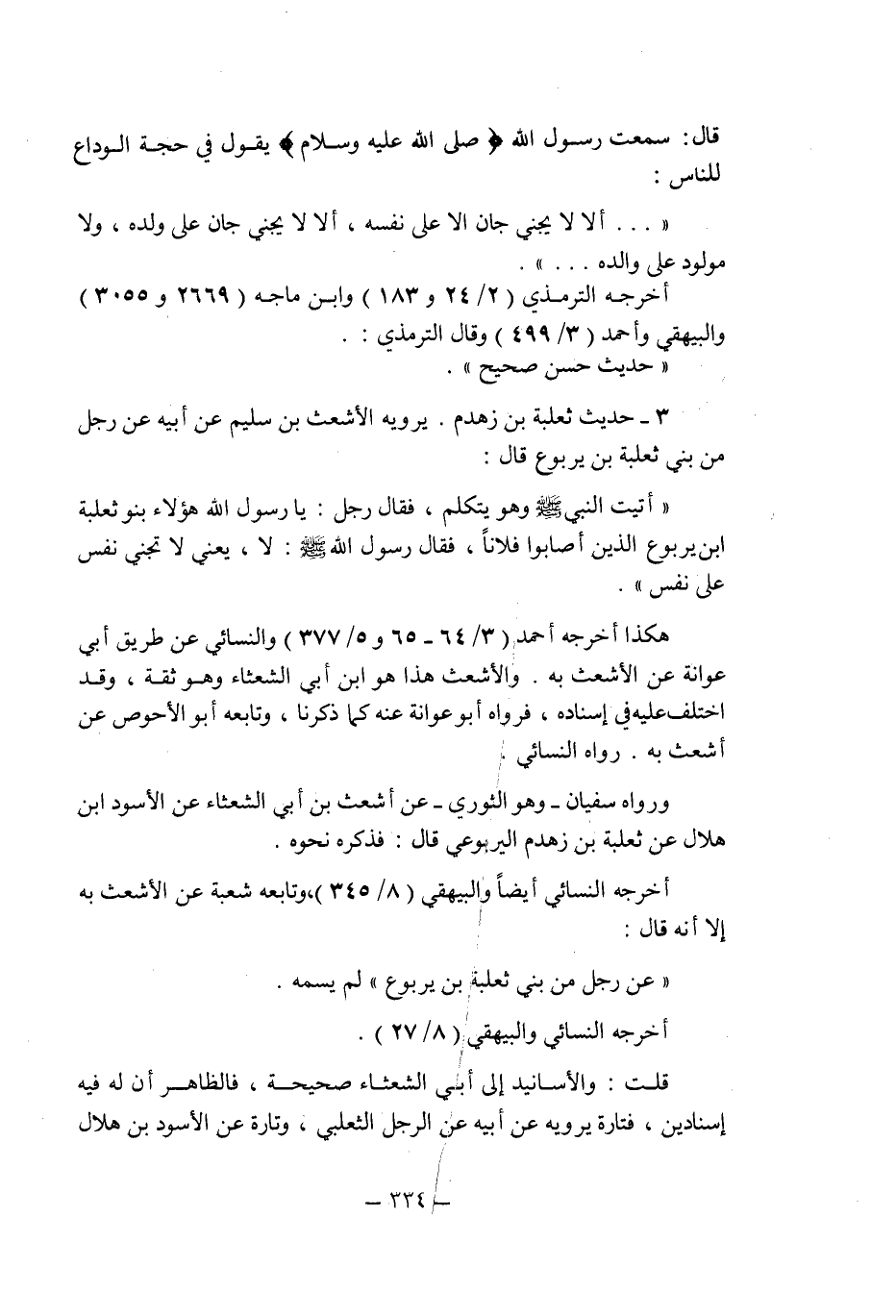 يرويه الأشعث بن سليم عن أبيه عن رجل من بنى ثعلبة بن يربوع قال: " أتيت النبى صلى الله عليه وسلم وهو يتكلم , فقال رجل: يا رسول الله هؤلاء بنو ثعلبة بن يربوع الذين أصابوا فلانا , فقال رسول الله صلى الله عليه وسلم: لا , يعنى لا تجنى نفس على نفس ".