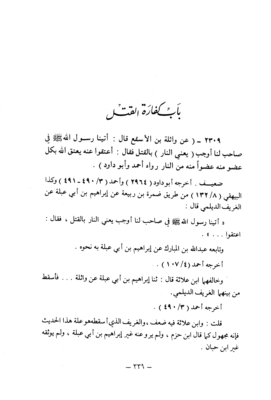 (2309) - (عن واثلة بن الأسقع قال: " أتينا رسول الله صلى الله عليه وسلم فى صاحب لنا أوجب (يعنى النار) بالقتل فقال: أعتقوا عنه يعتق الله بكل عضو منه عضوا منه من النار " رواه أحمد وأبو داود.