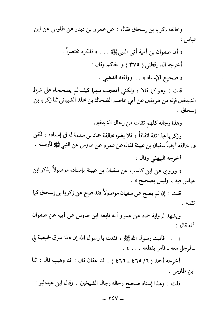 ويشهد لرواية حماد عن عمرو أنه تابعه ابن طاوس عن أبيه عن صفوان أنه قال: " ... فأتيت رسول الله صلى الله عليه وسلم , فقلت يا رسول الله إن هذا سرق خميصة لى ـ لرجل معه ـ فأمر بقطعه ... ".