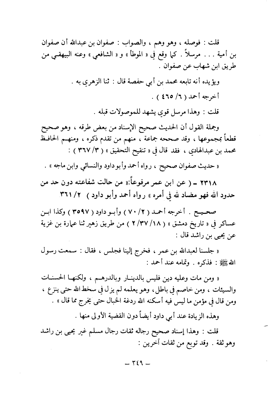 وجملة القول أن الحديث صحيح الإسناد من بعض طرقه , وهو صحيح قطعا بمجموعها , وقد صححه جماعة , منهم من تقدم ذكره , ومنهم الحافظ محمد بن عبد الهادى , فقد قال فى " تنقيح التحقيق " (3/367) : " حديث صفوان صحيح , رواه أحمد وأبو داود والنسائى ابن ماجه ".