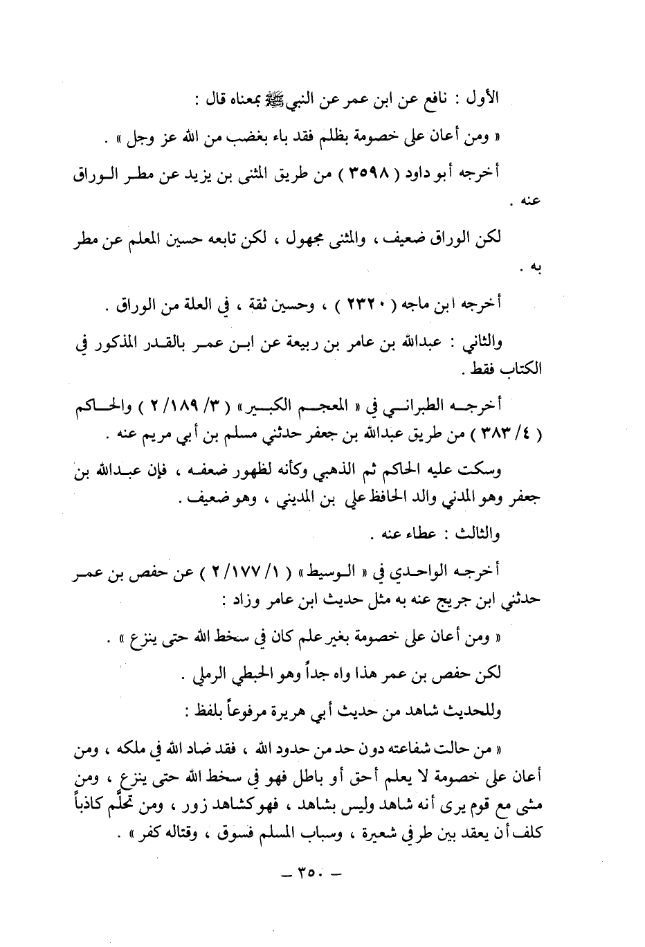 الأول: نافع عن ابن عمر عن النبى صلى الله عليه وسلم بمعناه قال: " ومن أعان على خصومة بظلم فقد باء بغضب من الله عز وجل ".