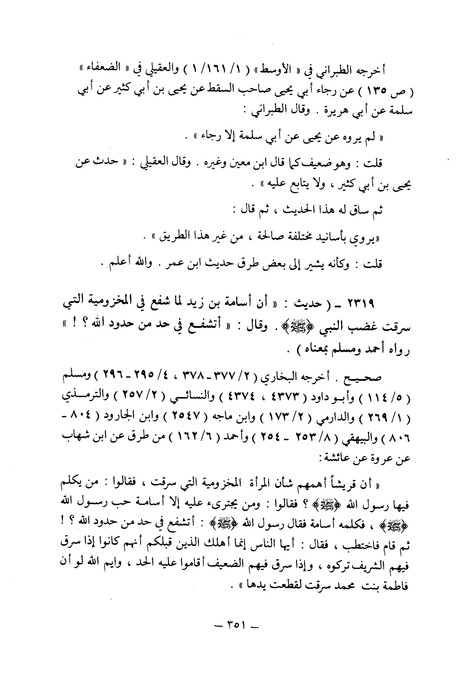 أخرجه البخارى (2/377 ـ 378 , 4/295 ـ 296) ومسلم (5/114) وأبو داود (4373 , 4734) والنسائى (2/257) والترمذى (1/269) والدارمى (2/173) وابن ماجه (2547) وابن الجارود (804 ـ 806) والبيهقى (8/253 ـ 254) وأحمد (6/162) من طرق عن ابن شهاب عن عروة عن عائشة: " أن قريشا أهمهم شأن المرأة المخزومية التى سرقت , فقالوا: من يكلم فيها رسول الله صلى الله عليه وسلم؟ فقالوا: ومن يجترىء عليه إلا أسامة حب رسول الله صلى الله عليه وسلم , فكلمه أسامة فقال رسول الله صلى الله عليه وسلم: أتشفع فى حد من حدود الله؟ ! ثم قام فاختطب , فقال: أيها الناس إنما أهلك الذين قبلكم أنهم كانوا إذا سرق فيهم الشريف تركوه , إذا سرق فيهم الضعيف أقاموا عليه الحد , وايم الله لو أن فاطمة بنت محمد سرقت لقطعت يدها ".