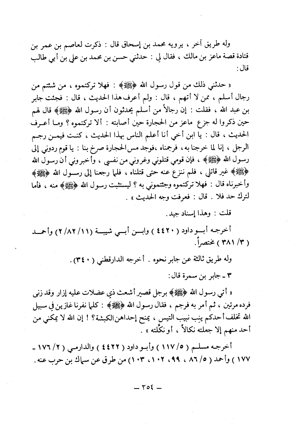 وله طريق آخر , يرويه محمد بن إسحاق قال: ذكرت لعاصم بن عمر بن قتادة قصة ماعز بن مالك , فقال لى: حدثنى حسن بن محمد بن على بن أبى طالب قال: " حدثنى ذلك من قول رسول الله صلى الله عليه وسلم: فهلا تركتموه , من شئتم من رجال أسلم , ممن لا أتهم , قال: ولم أعرف هذا الحديث , قال: فجئت جابر بن عبد الله , فقلت: إن رجالا من أسلم يحدثون أن رسول الله صلى الله عليه وسلم قال لهم حين ذكروا له جزع ماعز من الحجارة حين أصابته: ألا تركتموه؟ وما أعرف الحديث , قال: يا ابن أخى أنا أعلم الناس بهذا الحديث , كنت فيمن رجم الرجل , إنا لما خرجنا به , فرجمناه , فوجد مس الحجارة صرخ بنا: يا قوم ردونى إلى رسول الله صلى الله عليه وسلم , فإن قومى قتلونى وغرونى من نفسى , وأخبرونى أن رسول الله صلى الله عليه وسلم غير قاتلى , فم ننزع عنه حتى قتلناه , فلما رجعنا إلى رسول الله صلى الله عليه وسلم وأخبرناه قال: فهلا تركتموه وجئتمونى به؟ ليستثبت رسول الله صلى الله عليه وسلم منه , فأما لترك حد فلا.