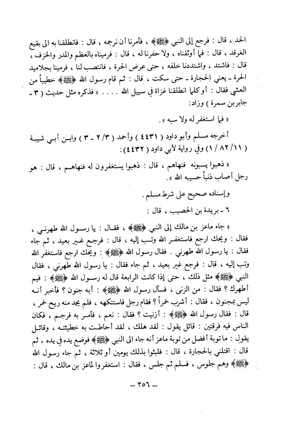 6 ـ بريدة بن الحصيب , قال: " جاء ماعز بن مالك إلى النبى صلى الله عليه وسلم , فقال: يا رسول الله طهرنى , فقال: ويحك ارجع استغفر الله وتب إليه , قال: فرجع غير بعيد , ثم جاء فقال: يا رسول الله طهرنى.
