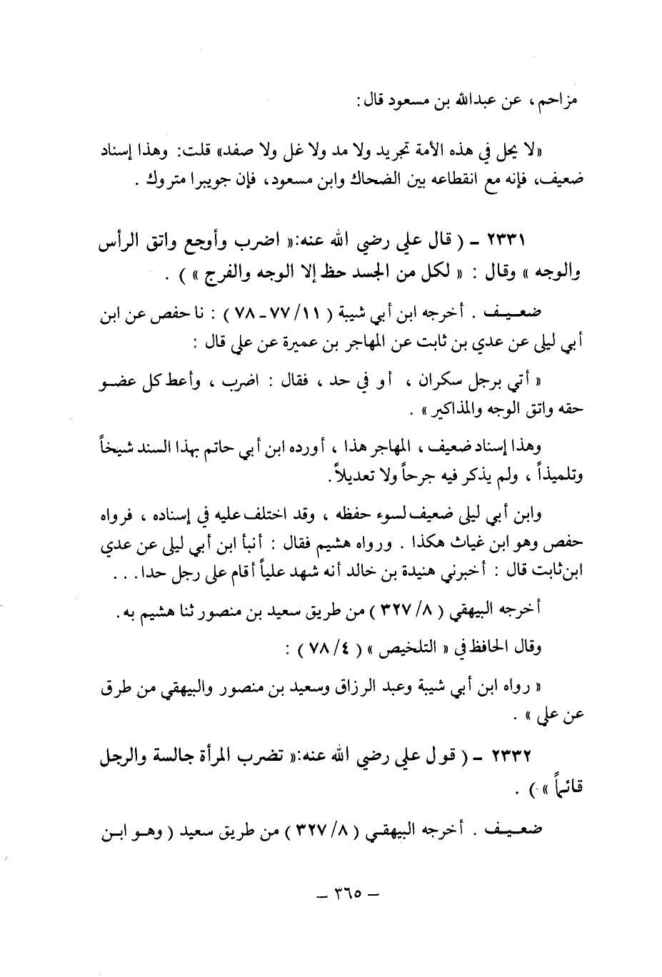 أخرجه ابن أبى شيبة (11/77 ـ 78) : أخبرنا حفص عن ابن أبى ليلى عن عدى بن ثابت عن المهاجر بن عميرة عن على قال: " أتى برجل سكران , أو فى حد , فقال: اضرب , وأعط كل عضو حقه واتق الوجه والمذاكير ".