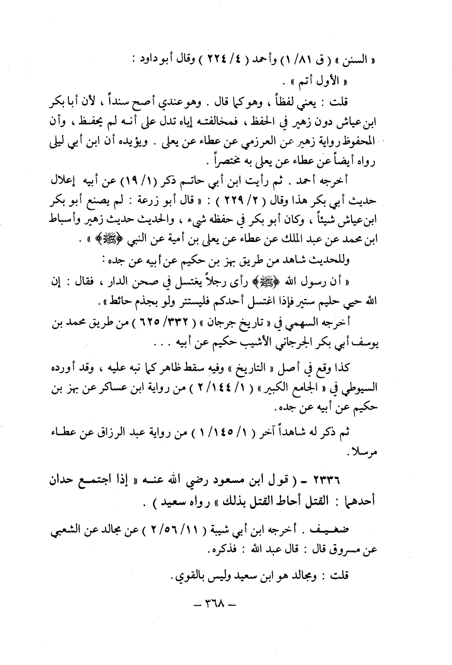 وهو عندى أصح سندا , لأن أبا بكر ابن عياش دون زهير فى الحفظ , فمخالفته إياه تدل على أنه لم يحفظ , وأن المحفوظ رواية زهير عن العرزمى عن عطاء عن يعلى.