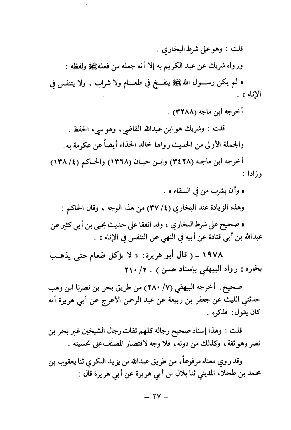 (1978) - (قال أبو هريرة: " لا يؤكل طعام حتى يذهب بخاره " رواه البيهقى بإسناد حسن (2/210) .