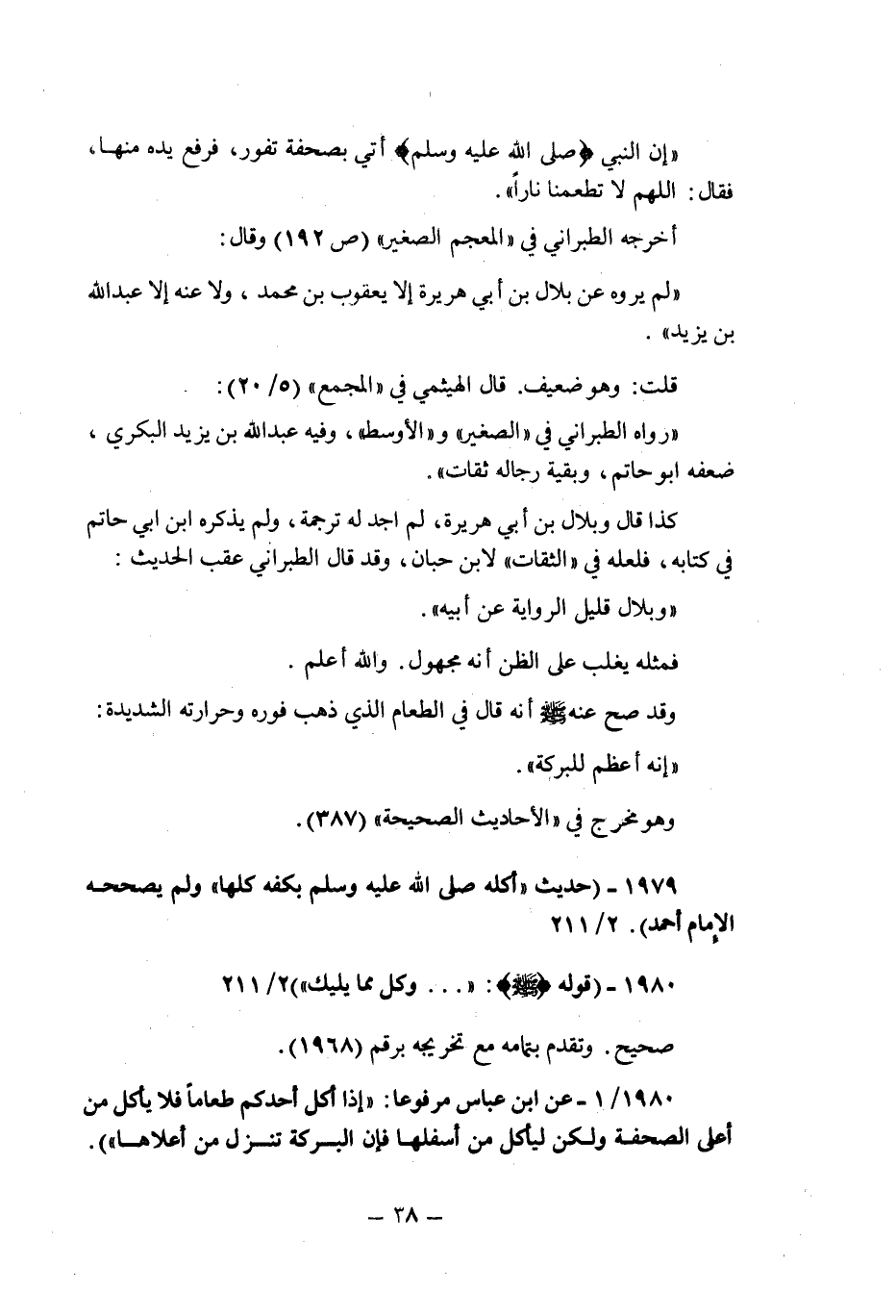 (1979) - (حديث: " أكله صلى الله عليه وسلم بكفه كلها " ولم يصححه الإمام أحمد (2/211) . [1]
