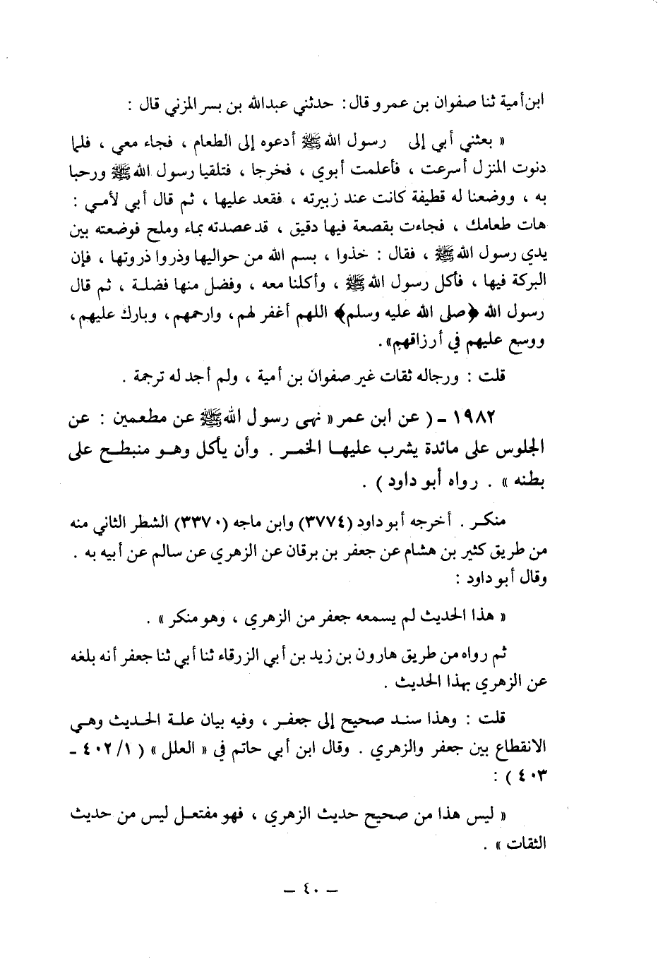 (1982) - (عن ابن عمر: " نهى رسول الله صلى الله عليه وسلم عن مطعمين: عن الجلوس على مائدة يشرب عليها الخمر , وأن يأكل وهو منبطح على بطنه " رواه أبو داود.