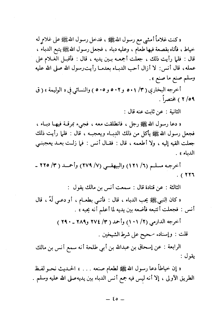 الثانية: عن ثابت عنه قال: " دعا رسول الله صلى الله عليه وسلم رجل , فانطلقت معه , فجىء بمرقة فيها دباء , فجعل رسول الله صلى الله عليه وسلم يأكل من ذلك الدباء ويعجبه , قال: فلما رأيت ذلك جعلت ألقيه إليه , ولا أطعمه , قال: فقال أنس: فمازلت بعد يعجبنى الدباء " أخرجه مسلم (6/121) والبيهقى (7/279) وأحمد (3/225 ـ 226) .