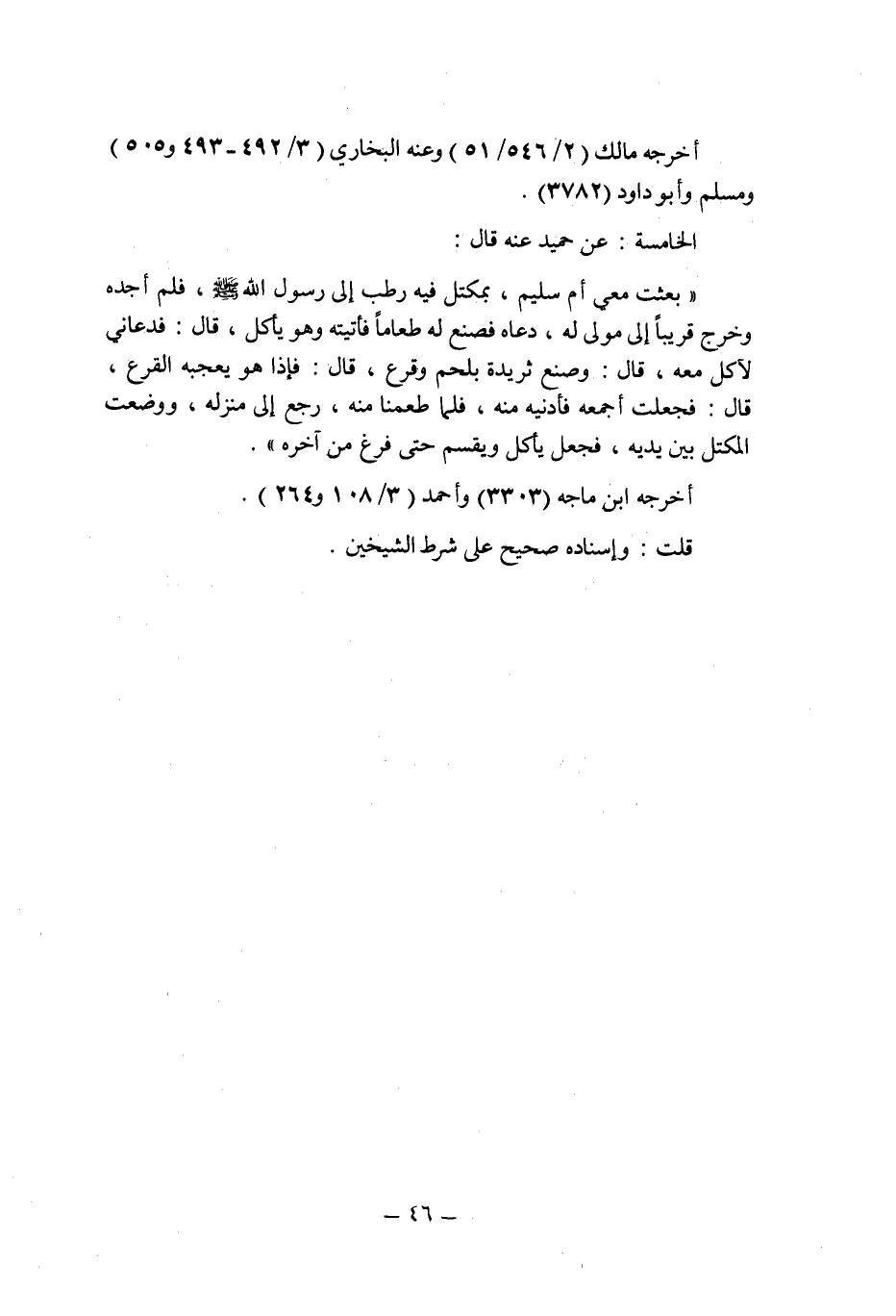 الخامسة: عن حميد عنه قال: " بعثت معى أم سليم , بمكتل فيه رطب إلى رسول الله صلى الله عليه وسلم , فلم أجده وخرج قريبا إلى مولى له , دعاه فصنع له طعاما فأتيته وهو يأكل , قال: فدعانى لآكل معه , قال: وصنع ثريدة بلحم وقرع , قال: فإذا هو يعجبه القرع , قال: فجعلت أجمعه فأدنيه منه , فلما طعمنا منه , رجع إلى منزله , ووضعت المكتل بين يديه , فجعل يأكل ويقسم حتى فرغ من آخره ".