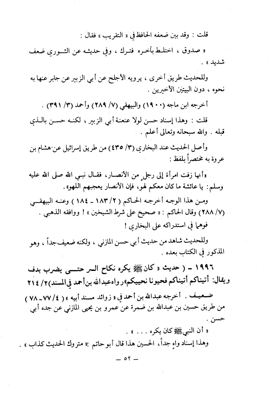 (1996) - (حديث: " كان صلى الله عليه وسلم يكره نكاح السر حتى يضرب بدف ويقال: أتيناكم أتيناكم فحيونا نحييكم " رواه عبد الله بن أحمد فى المسند (2/214) .