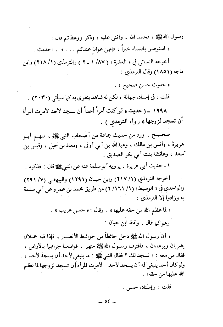 (1998) - (حديث: " لو كنت آمرا أحدا أن يسجد لأحد لأمرت المرأة أن تسجد لزوجها " رواه الترمذى.