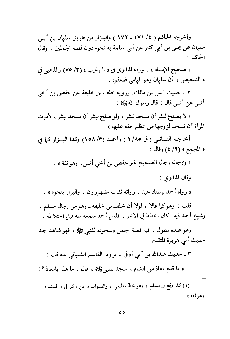 3 ـ حديث عبد الله بن أبى أوفى , يرويه القاسم الشيبانى عنه قال: " لما قدم معاذ من الشام , سجد للنبى صلى الله عليه وسلم , قال: ما هذا يا معاذ؟ !