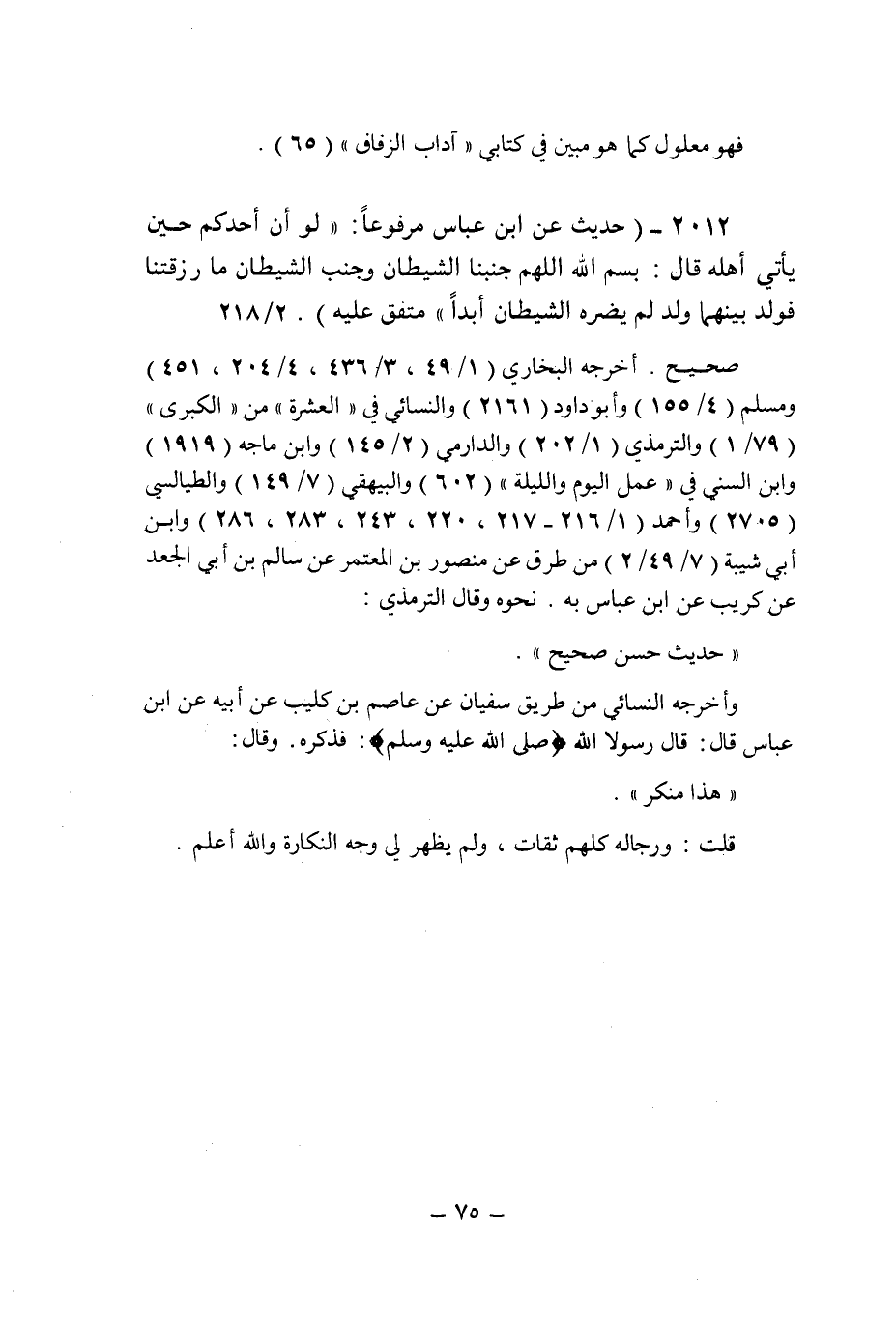 (2012) - (حديث عن ابن عباس مرفوعا: " لو أن أحدكم حين يأتى أهله قال: بسم الله اللهم جنبنا الشيطان وجنب الشيطان ما رزقتنا فولد بينهما ولد لم يضره الشيطان أبدا " متفق عليه (2/218) .
