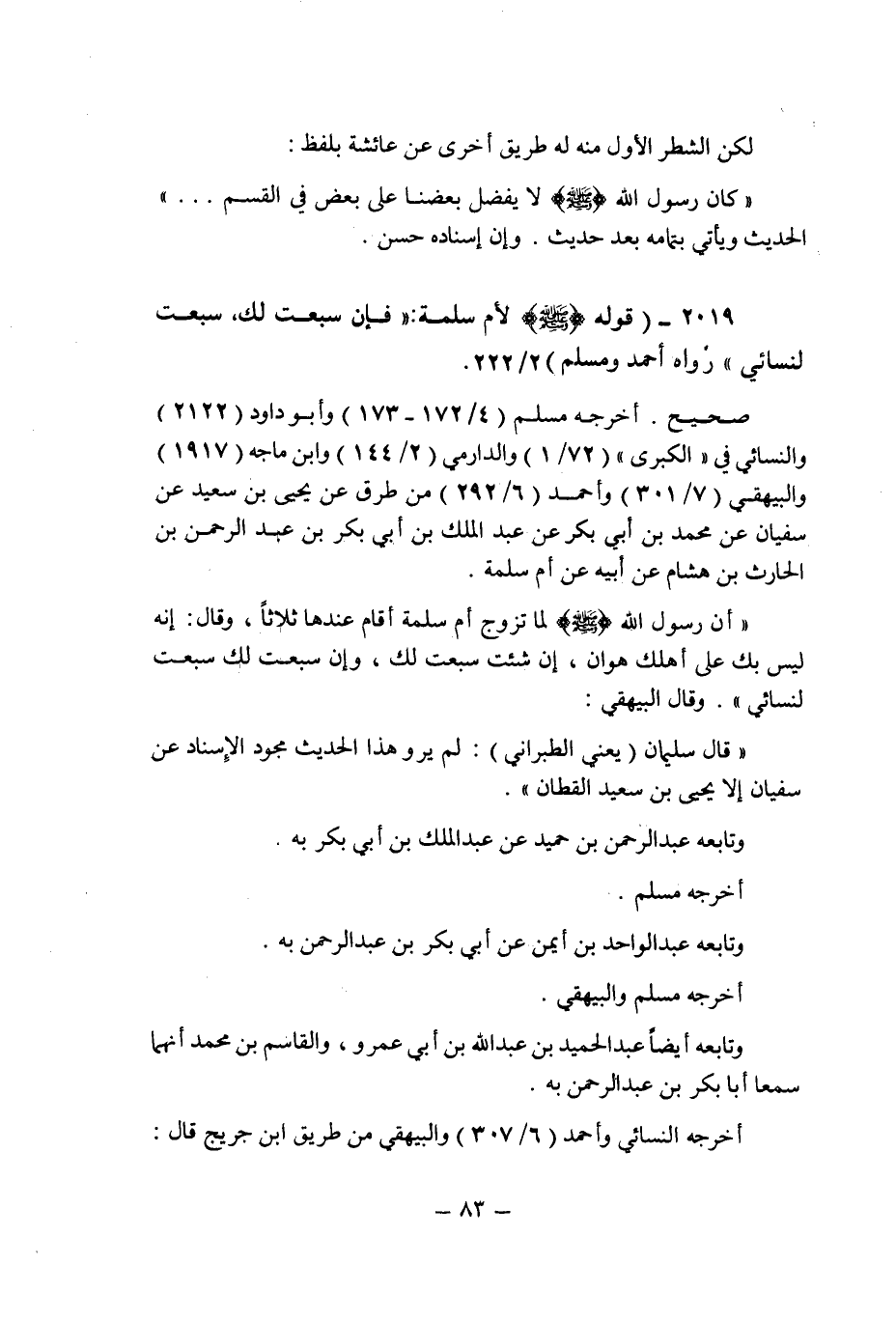 أخرجه مسلم (4/172 ـ 173) وأبو داود (2122) والنسائى فى " الكبرى (72/1) والدارمى (2/144) وابن ماجه (1917) والبيهقى (7/301) وأحمد (6/292) من طرق عن يحيى بن سعيد عن سفيان عن محمد بن أبى بكر عن عبد الملك بن أبى بكر ابن عبد الرحمن بن الحارث بن هشام عن أبيه عن أم سلمة: " أن رسول الله صلى الله عليه وسلم لما تزوج أم سلمة أقام عندها ثلاثا , وقال: إنه ليس بك على أهلك هوان , إن شئت سبعت لك , وإن سبعت لك سبعت لنسائى " وقال البيهقى: " قال سليمان (يعنى الطبرانى) : لم يرو هذا الحديث مجود الإسناد عن سفيان إلا يحيى بن سعيد القطان ".