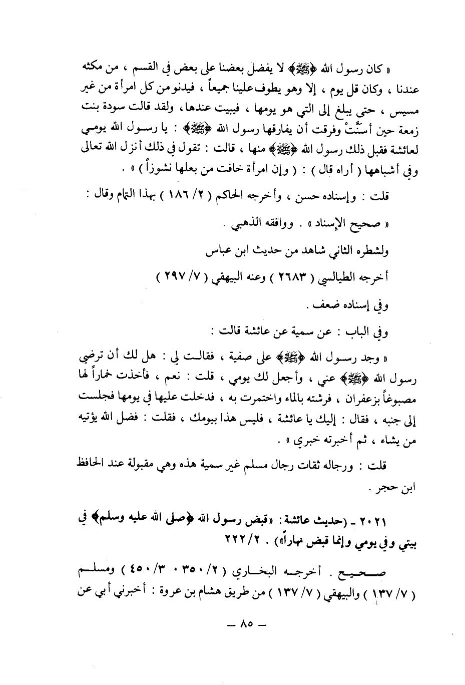 (2021) - (حديث عائشة: " قبض رسول الله صلى الله عليه وسلم فى بيتى وفى يومى وإنما قبض نهارا " (2/222) .