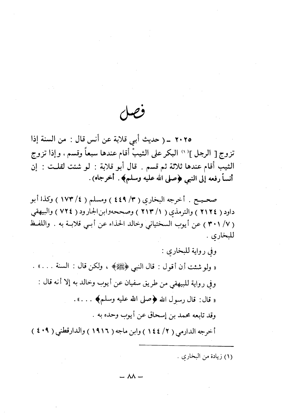(2025) - (حديث أبى قلابة عن أنس قال: " من السنة إذا تزوج [الرجل] (1) البكر على الثيب أقام عندها سبعا وقسم , وإذا تزوج الثيب أقام عندها ثلاثا ثم قسم. قال أبو قلابة: لو شئت لقلت: إن أنسا رفعه إلى النبى صلى الله عليه وسلم " أخرجاه.