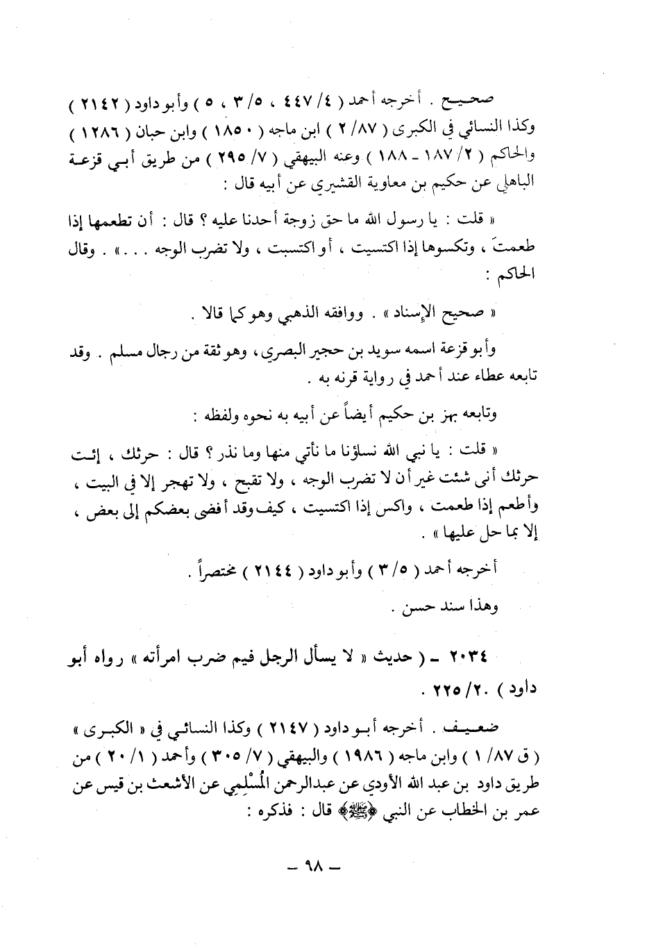 أخرجه أحمد (4/447 , 5/3 , 5) وأبو داود (2142) وكذا النسائى فى الكبرى (87/2) وابن ماجه (1850) وابن حبان (1286) والحاكم (2/187 ـ 188) وعنه البيهقى (7/295) من طريق أبى قزعة الباهلى عن حكيم بن معاوية القشيرى عن أبيه قال: " قلت: يا رسول الله , ما حق زوجة أحدنا عليه؟ قال: أن تطعمها إذا طعمت , وتكسوها إذا اكتسيت , أو اكتسبت , ولا تضرب الوجه ... ".