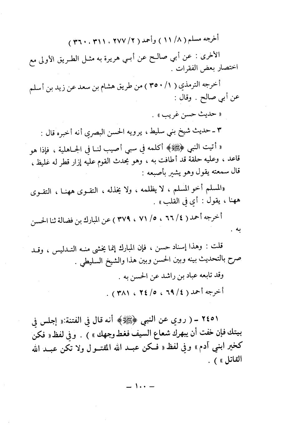 (2451) - (روى عن النبى صلى الله عليه وسلم أنه قال فى الفتنة: " اجلس فى بيتك فإن خفت أن يبهرك شعاع السيف فغط وجهك " وفى لفظ: " فكن كخير ابنى آدم " وفى لفظ: " فكن عبد الله المقتول ولا تكن عبد الله القاتل ".