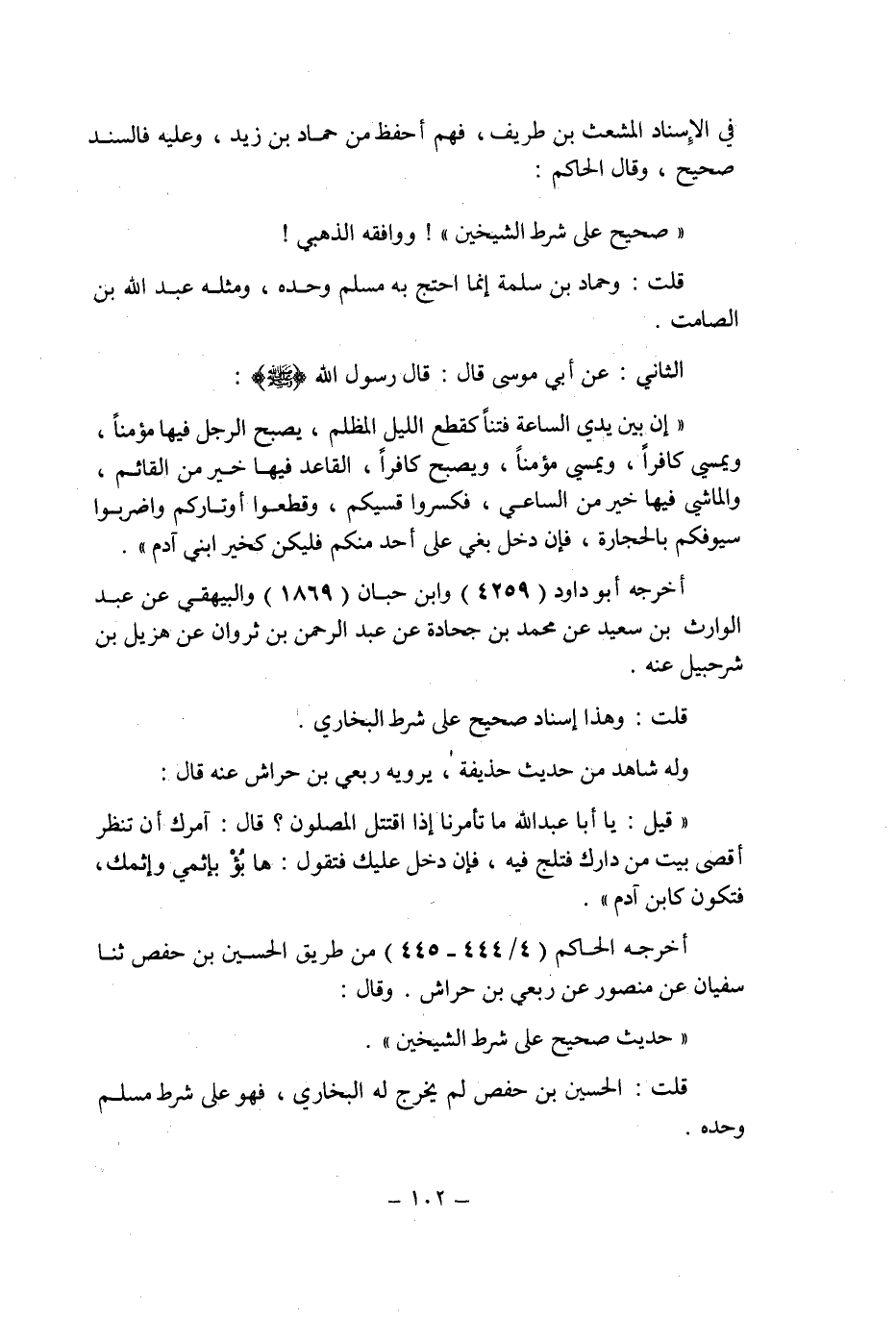 الثانى: عن أبى موسى قال: قال رسول الله صلى الله عليه وسلم: " إن بين يدى الساعة فتنا كقطع الليل المظلم , يصبح الرجل فيها مؤمنا , ويمسى كافرا , ويمسى مؤمنا , ويصبح كافرا , القاعد فيها خير من القائم , والماشى فيها خير من الساعى , فكسروا قسيكم , وقطعوا أوتاركم واضربوا سيوفكم بالحجارة , فإن دخل بغى على أحد منكم فليكن كخير ابنى آدم " أخرجه أبو داود (4259) وابن حبان (1869) والبيهقى عن عبد الوارث بن سعيد عن محمد بن جحادة عن عبد الرحمن بن ثروان عن هزيل بن شرحبيل عنه.