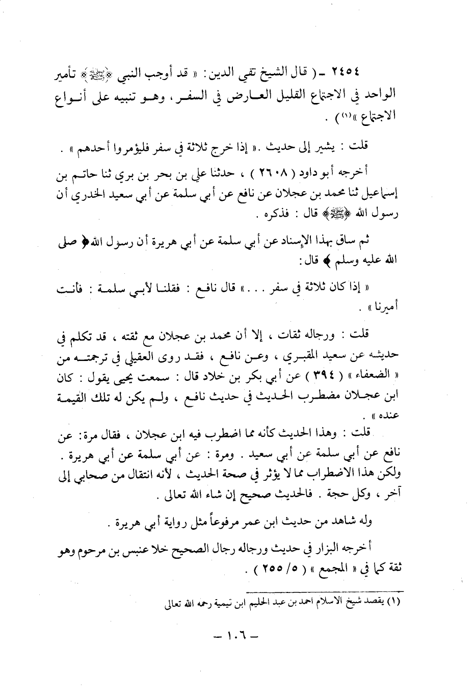(2454) - (قال الشيخ تقى الدين: " قد أوجب النبى صلى الله عليه وسلم تأمير الواحد فى الاجتماع القليل العارض فى السفر , وهو تنبيه على أنواع الاجتماع ".