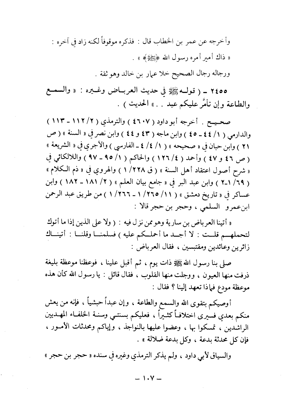 أخرجه أبو داود (4607) والترمذى (2/112 ـ 113) والدارمى (1/44 ـ 45) وابن ماجه (43 و44) وابن نصر فى " السنة " (ص 21) وابن حبان فى " صحيحه " (1/4/4 ـ الفارسى) والآجرى فى " الشريعة " (ص 46 و47) وأحمد (4/126) والحاكم (1/95 ـ 97) واللالكائى فى " شرح أصول اعتقاد أهل السنة " (ق 228/1) والهروى فى " ذم الكلام " (69/1 ـ 2) وابن عبد البر فى " جامع بيان العلم " (2/181 ـ 182) وابن عساكر فى " تاريخ دمشق " (11/265/1 ـ 266/1) من طريق عبد الرحمن ابن عمرو السلمى , وحجر ابن حجر قالا: " أتينا العرباض بن سارية وهو ممن نزل فيه: (ولا على الذين إذا ما أتوك لتحملهم قلت لا أجد ما أحملكم عليه) فسلمنا وقلنا: أتيناك زائرين وعائدين ومقتبسين , فقال العرباض: صلى بنا رسول الله صلى الله عليه وسلم ذات يوم , ثم أقبل علينا , فوعظنا موعظة بليغة ذرفت منها العيون , ووجلت منها القلوب , فقال قائل: يا رسول الله كأن هذه موعظة مودع فماذا تعهد إلينا؟ فقال: أوصيكم بتقوى الله والسمع والطاعة , وإن عبدا حبشيا , فإنه من يعش منكم بعدى فسيرى اختلافا كثيرا , فعليكم بسنتى وسنة الخلفاء المهديين الراشدين , تمسكوا بها , وعضوا عليها بالنواجذ , وإياكم ومحدثات الأمور , فإن كل محدثة بدعة , وكل بدعة ضلالة ".