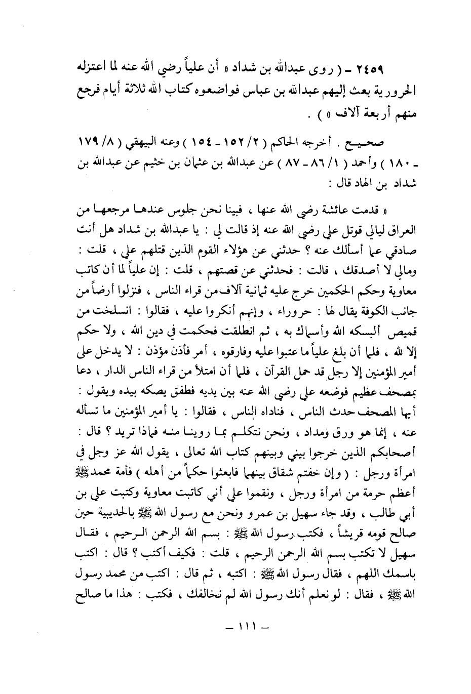 أخرجه الحاكم (2/152 ـ 154) وعنه البيهقى (8/179 ـ 180) وأحمد (1/86 ـ 87) عن عبد الله بن عثمان بن خيثم عن عبد الله بن شداد بن الهاد قال: " قدمت عائشة رضى الله عنها , فبينا نحن جلوس عندها مرجعها من العراق ليالى قتل على رضى الله عنه إذا قالت لى: يا عبد الله بن شداد هل أنت صادقى عما أسألك عنه؟ حدثنى عن هؤلاء القوم الذين قتلهم على , قلت: ومالى لا أصدقك , قالت: فحدثنى عن قصتهم , قلت: إن عليا لما أن كتب معاوية وحكم الحكمين خرج عليه ثمانية آلاف من قراء الناس , فنزلوا أرضا من جانب الكوفة يقال لها: حروراء , وإنهم أنكروا عليه , فقالوا: انسلخت من قميص ألبسكه الله وأسماك به , ثم انطلقت فحكمت فى دين الله , ولا حكم إلا لله , فلما أن بلغ عليا ما عتبوا عليه وفارقوه , أمر فأذن مؤذن: لا يدخل على أمير المؤمنين إلا رجل قد حمل القرآن , فلما أن امتلأ من قراء الناس الدار , دعا بمصحف عظيم فوضعه على رضى الله عنه بين يديه فطفق يصكه بيده ويقول أيها المصحف حدث الناس , فناداه الناس , فقالوا: يا أمير المؤمنين ما تسأله عنه , إنما هو ورق ومداد , ونحن نتكلم بما روينا منه فماذا تريد؟ قال: أصحابكم الذين خرجوا بينى وبينهم كتاب الله تعالى , يقول الله عز وجل فى امرأة ورجل (وإن خفتم شقاق بينهما فابعثوا حكما من أهله) فأمة محمد صلى الله عليه وسلم أعظم حرمة من امرأة ورجل , ونقموا على أنى كاتبت معاوية وكتبت على بن أبى طالب , وقد جاء سهيل بن عمرو ونحن مع رسول الله صلى الله عليه وسلم بالحديبية حين صالح قومه قريشا , فكتب رسول الله صلى الله عليه وسلم: بسم الله الرحمن الرحيم , فقال: سهيل لا تكتب بسم الله الرحمن الرحيم , قلت: فكيف أكتب؟ قال: اكتب باسمك اللهم , فقال رسول الله صلى الله عليه وسلم: اكتبه , ثم قال: اكتب من محمد رسول الله صلى الله عليه وسلم , فقال: لو نعلم أنك رسول الله لم نخالفك , فكتب: هذا ما صالح