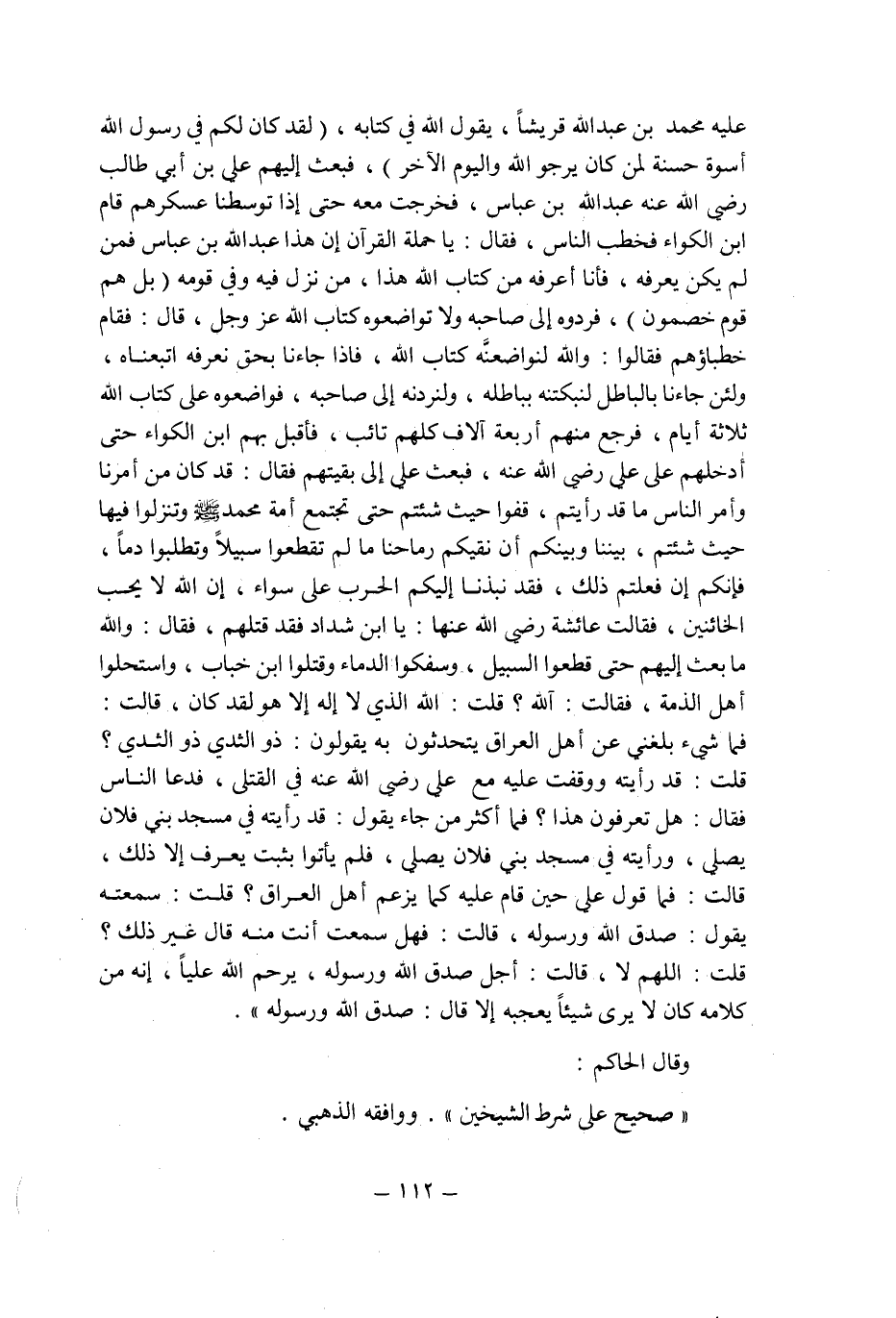 عليه محمد بن عبد الله قريشا , يقول الله فى كتابه: (لقد كان لكم فى رسول الله أسوة حسنة لمن كان يرجو الله واليوم الآخر) . فبعث إليهم على بن أبى طالب رضى الله عنه عبد الله بن عباس , فخرجت معه حتى إذا توسطنا عسكرهم قام ابن الكواء فخطب الناس , فقال: يا حملة القرآن إن هذا عبد الله بن عباس فمن لم يكن يعرفه , فأنا أعرفه من كتاب الله , هذا من نزل فيه وفى قومه (بل هم قوم خصمون) , فردوه إلى صاحبه ولا توضعوه كتاب الله عز وجل , قال: فقام خطباؤهم فقالوا: والله لنواضعنه كتاب الله , فإذا جاءنا بحق نعرفه اتبعناه , ولئن جاءنا بالباطل لنبكتنه بباطله , ولنردنه إلى صاحبه , فواضعوه على كتاب الله ثلاثة أيام , فرجع منهم أربعة آلاف كلهم تائب , فأقبل بهم ابن الكواء حتى أدخلهم على على رضى الله عنه , فبعث على إلى بقيتهم فقال: قد كان من أمرنا وأمر الناس ما قد رأيتم , قفوا حيث شئتم حتى تجتمع أمة محمد صلى الله عليه وسلم وتنزلوا فيها حيث شئتم , بيننا وبينكم أن نقيكم رماحنا ما لم تقطعوا سبيلا وتطلبوا دما , فإنكم إن فعلتم ذلك , فقد نبذنا إليكم الحرب على سواء , إن الله لا يحب الخائنين , فقالت عائشة رضى الله عنها: يا ابن شداد فقد قتلهم , فقال: والله ما بعث إليهم حتى قطعوا السبيل , وسفكوا الدماء وقتلوا ابن خباب , واستحلوا أهل الذمة , فقالت: آلله؟ قلت: آلله الذى لا إله إلا هو لقد كان , قالت: فما شىء بلغنى عن أهل العراق يتحدثون به يقولون: ذو الثدى ذو الثدى؟ قلت: قد رأيته ووقفت عليه مع على رضى الله عنه فى القتلى , فدعى الناس فقال هل تعرفون هذا فما أكثر من جاء يقول: قد رأيته فى مسجد بنى فلان يصلى , ورأيته فى مسجد بنى فلان يصلى , فلم يأتوا بثبت يعرف إلا ذلك , قالت: فما قول على حين قام عليه كما يزعم أهل العراق؟ قالت: سمعته يقول: صدق الله ورسوله , قالت: فهل سمعت أنت منه قال غير ذلك؟ قلت: اللهم لا , قالت: أجل صدق الله ورسوله , يرحم الله عليا , إنه من كلامه كان لا يرى شيئا يعجبه إلا قال: صدق الله ورسوله ".
