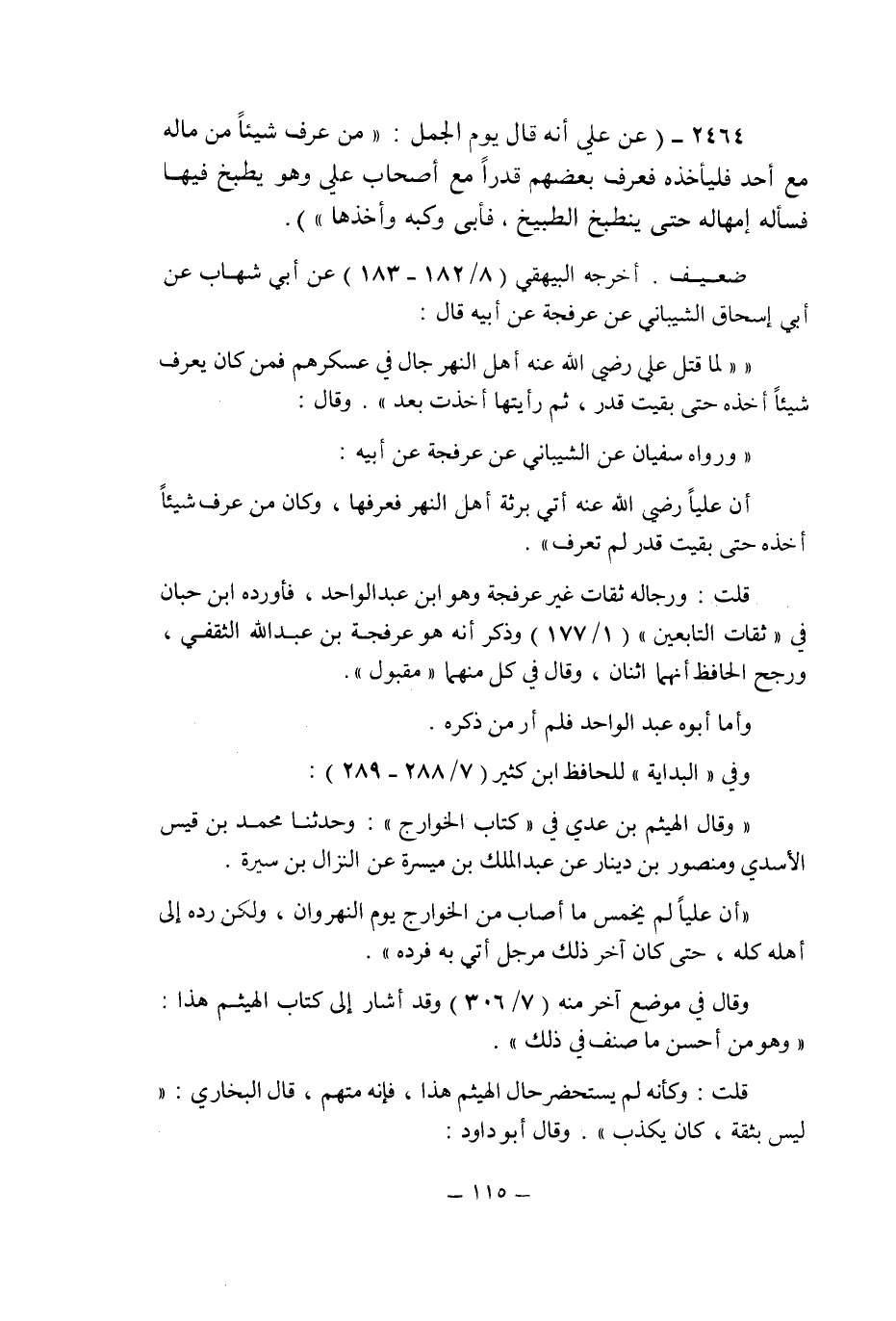 وفى " البداية " للحافظ ابن كثير (7/288 ـ 289) : " وقال الهيثم بن عدى فى " كتاب الخوارج ": وحدثنا محمد بن قيس الأسدى ومنصور بن دينار عن عبد الملك بن ميسرة عن النزال بن (سيرة) [1] : " أن عليا لم يخمس ما أصاب من الخوارج يوم النهروان , ولكن رده إلى أهله كله , حتى كان آخر ذلك مرجل أتى به فرده ".