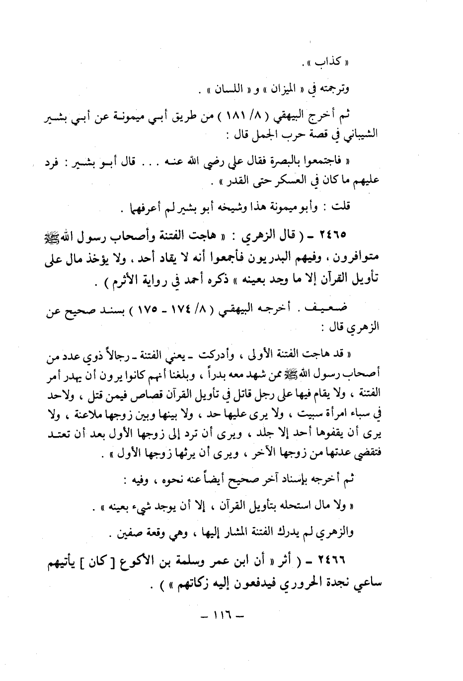 (2465) - (قال الزهرى: " هاجت الفتنة وأصحاب رسول الله صلى الله عليه وسلم متوافرون , وفيهم البدريون فأجمعوا أنه لا يقاد أحد , ولا يؤخذ مال على تأويل القرآن إلا ما وجد بعنيه " ذكره أحمد فى رواية الأثرم.
