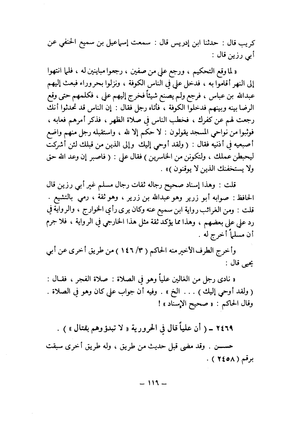 (2469) - (أن عليا قال فى الحرورية: " لا تبدءوهم بقتال ".