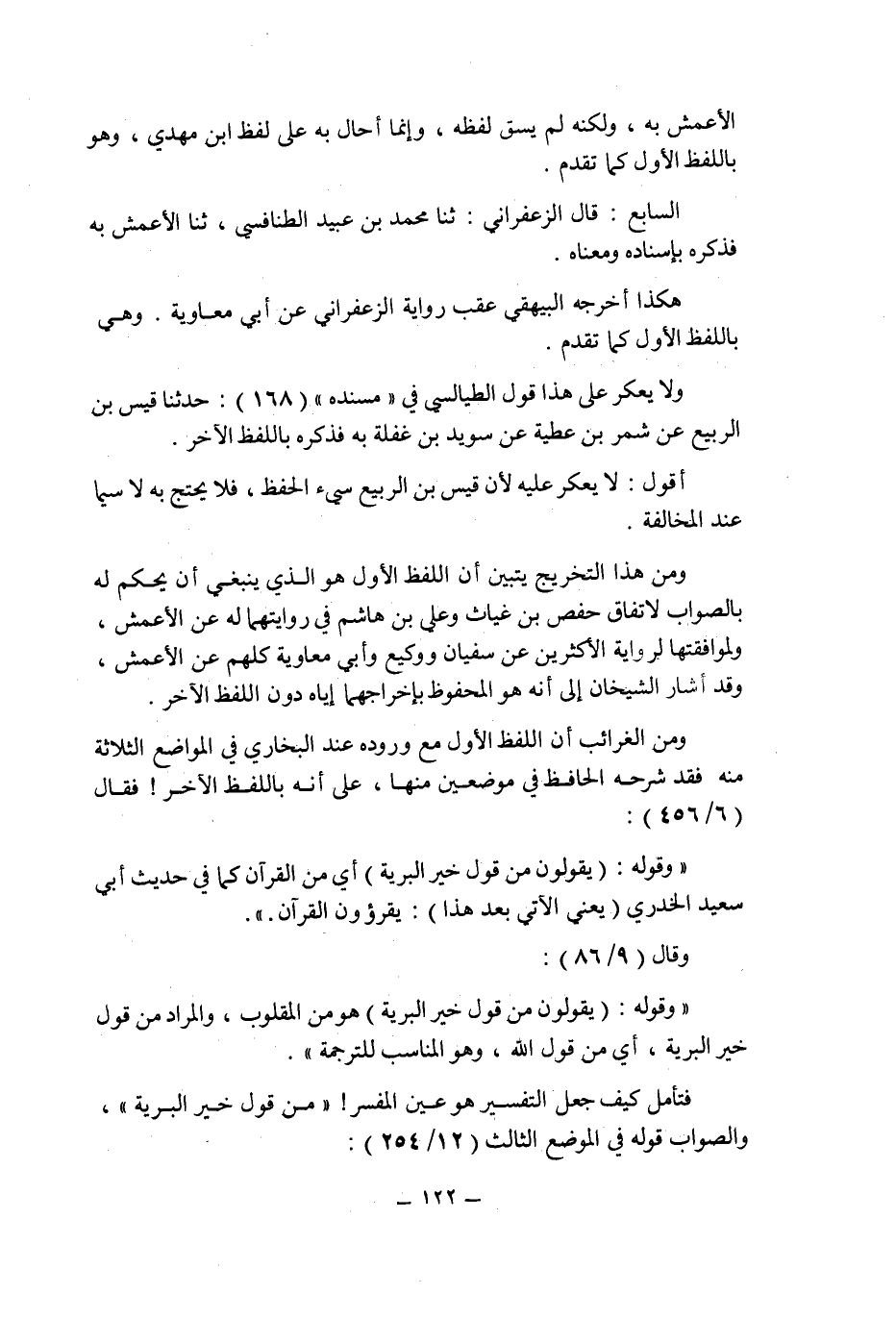 ومن الغرائب أن اللفظ الأول مع وروده عند البخارى فى المواضع الثلاثة منه فقد شرحه الحافظ فى موضعين منها , على أنه باللفظ الآخر! فقال (6/456) : " وقوله: (يقولون من قول خير البرية) أى من القرآن كما فى حديث أبى سعيد الخدرى (يعنى الآتى بعد هذا) : يقرءون القرآن.