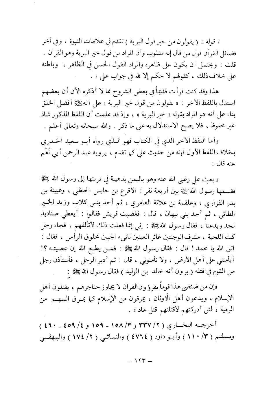وأما اللفظ الآخر الذى فى الكتاب فهو الذى رواه أبو سعيد الخدرى بخلاف اللفظ الأول فإنه من حديث على كما تقدم , يرويه (عبد الرحمن أبى نعم) [1] عنه قال: " بعث على رضى الله عنه وهو باليمن بذهيبة فى تربتها إلى رسول الله صلى الله عليه وسلم فقسمها رسول الله صلى الله عليه وسلم بين أربعة نفر: الأقرع بن حابس الحنظلى , وعيينة بن بدر الفزارى , وعلقمة بن علاثة العامرى , ثم أحد بنى كلاب وزيد الخير الطائى , ثم أحد بنى نبهان , قال: فغضبت قريش فقالوا: أيعطى صناديد نجد ويدعنا , فقال رسول الله صلى الله عليه وسلم: إنى إنما فعلت ذلك لأتألفهم , فجاء رجل كث اللحية , مشرف الوجنتين غائر العينين ناتىء الجبين محلوق الرأس , فقال: اتق الله يا محمد! قال: فقال رسول الله صلى الله عليه وسلم فمن يطع الله إن عصيته؟ ! أيأمننى على أهل الأرض , ولا تأمنونى , قال: ثم أدبر الرجل , فأستأذن رجل من القوم فى قتله (يرون أنه خالد بن الوليد) فقال رسول الله صلى الله عليه وسلم: " إن من ضئضى هذا قوما يقرءون القرآن لا يجاوز حناجرهم , يقتلون أهل الإسلام , ويدعون أهل الأوثان , يمرقون من الإسلام كما يمرق السهم من الرمية , لئن أدركتهم لأقتلنهم قتل عاد ".