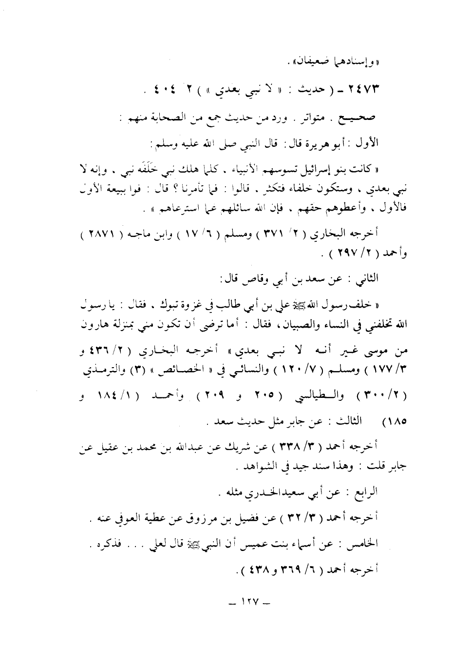 (2473) - (حديث: " لا نبى بعدى " (2/404) .