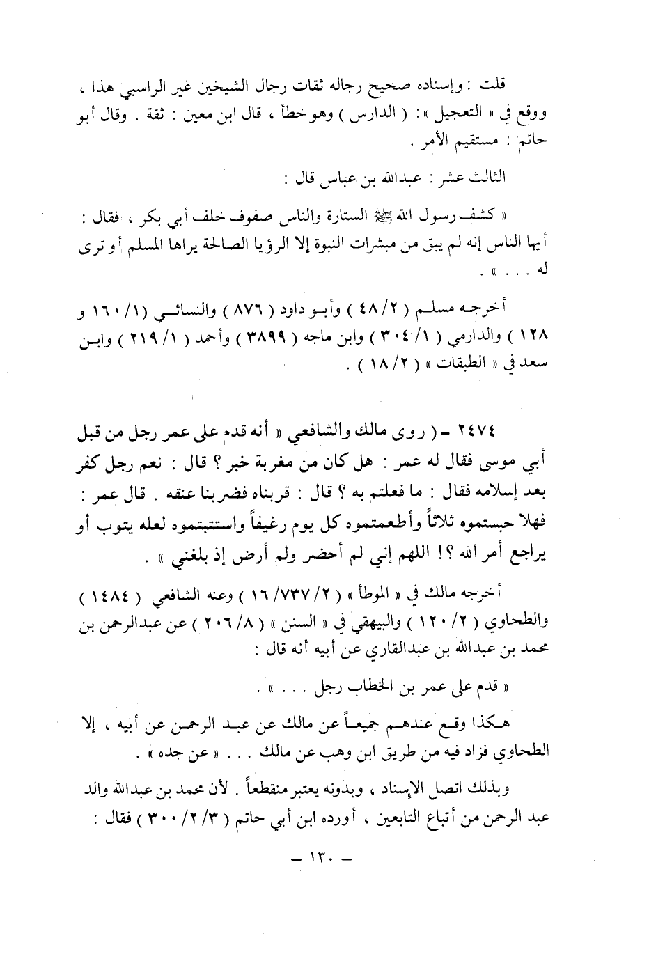 الثالث عشر: عبد الله بن عباس قال: " كشف رسول الله صلى الله عليه وسلم الستارة والناس صفوف خلف أبى بكر , فقال: أيها الناس إنه لم يبق من مبشرات النبوة إلا الرؤيا الصالحة يراها المسلم أو ترى له ... "