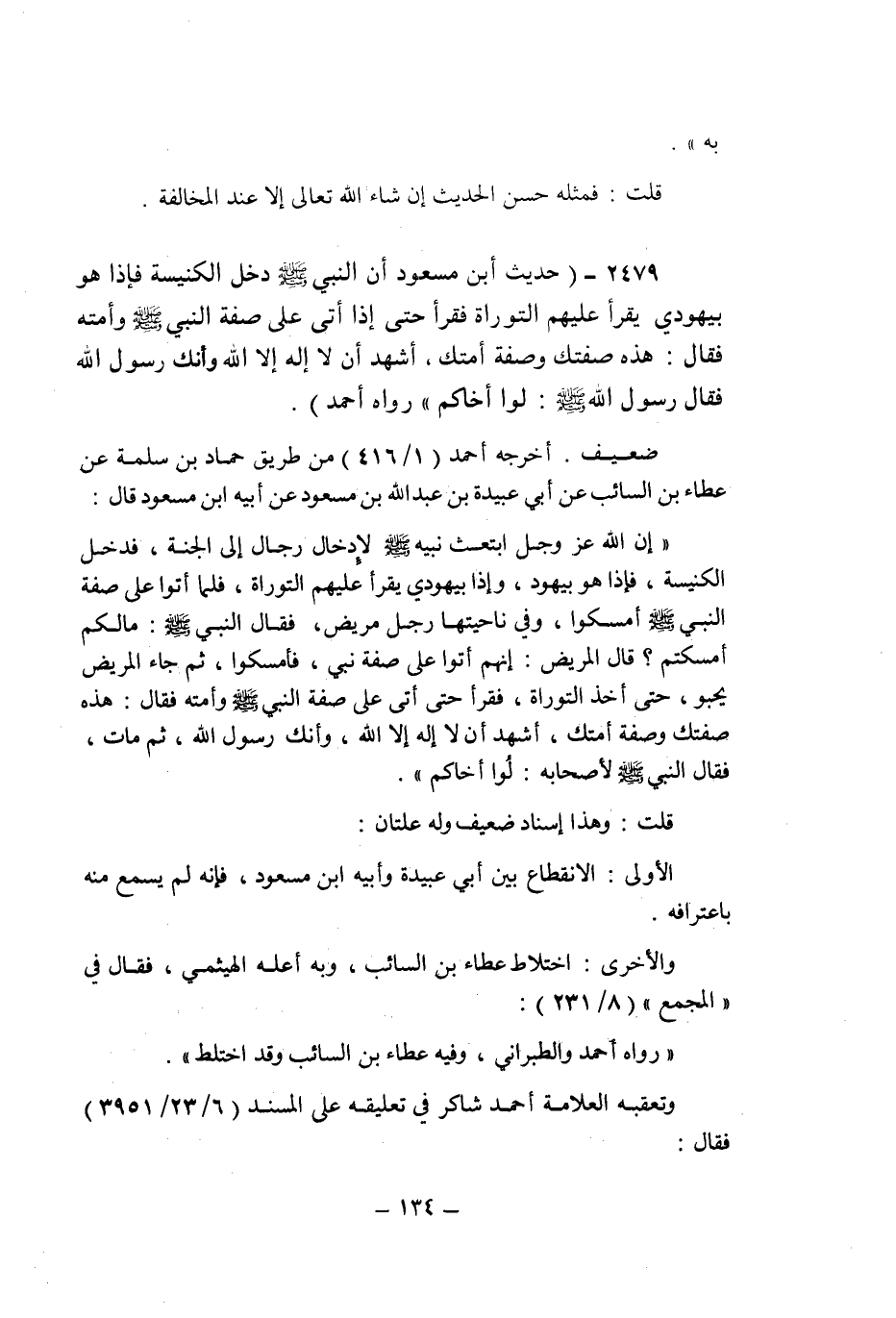 (2479) - (حديث ابن مسعود: " أن النبى صلى الله عليه وسلم دخل الكنيسة فإذا هو بيهودى يقرأ عليهم التوراة فقرأ حتى إذا أتى على صفة النبى صلى الله عليه وسلم وأمته فقال: هذه صفتك وصفة أمتك , أشهد أن لا إله إلا الله وأنك رسول الله فقال رسول الله صلى الله عليه وسلم: لوا أخاكم " رواه أحمد.