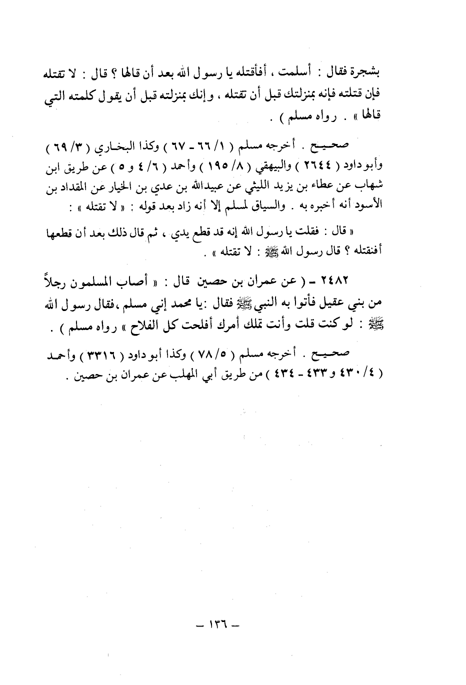 (2482) - (عن عمران بن حصين قال: " أصاب المسلمون رجلا من بنى عقيل فأتوا به النبى صلى الله عليه وسلم فقال: يا محمد إنى مسلم , فقال رسول الله صلى الله عليه وسلم: لو كنت قلت وأنت تملك أمرك أفلحت كل الفلاح " رواه مسلم.
