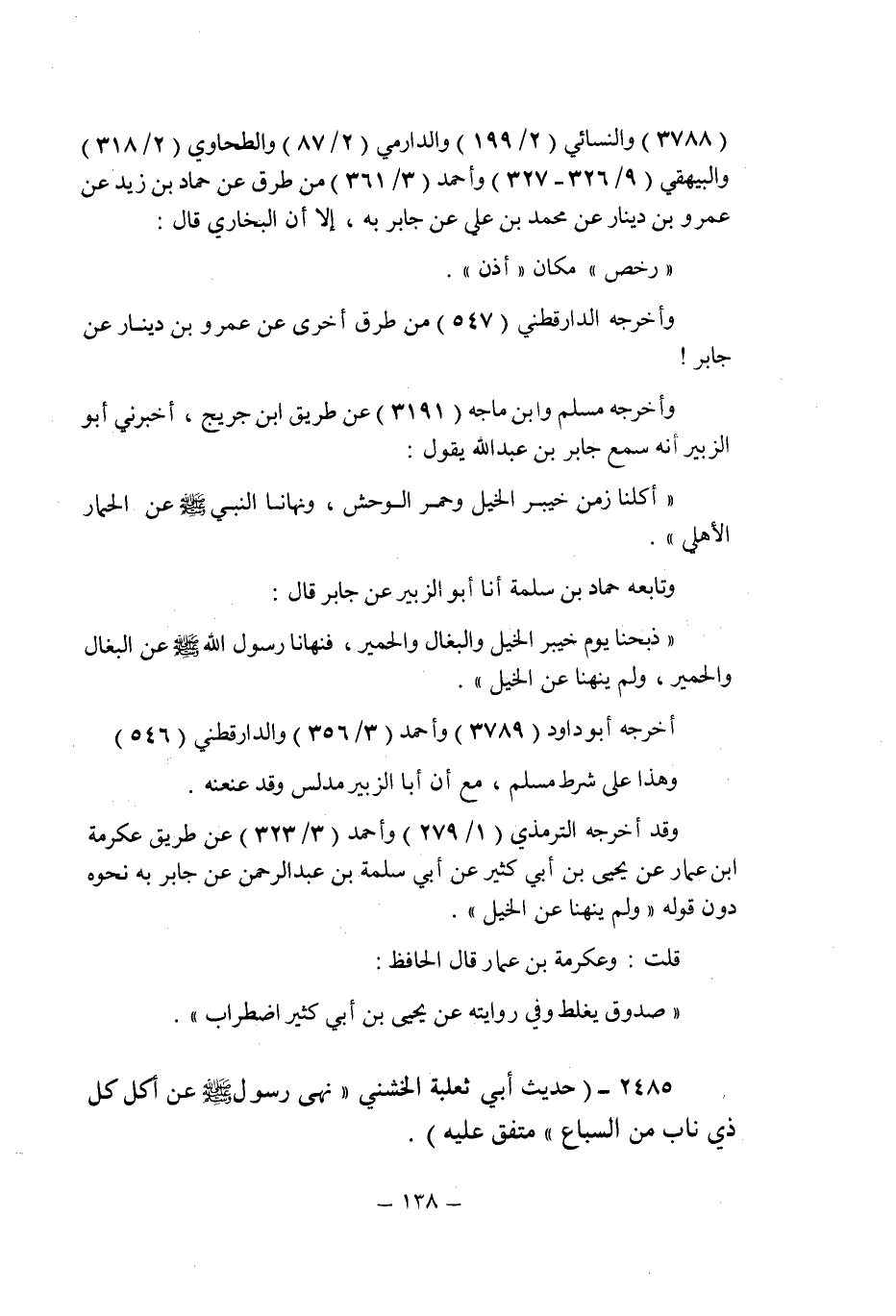 وتابعه حماد بن سلمة أنبأنا أبو الزبير عن جابر قال: " ذبحنا يوم خيبر الخيل والبغال والحمير , فنهانا رسول الله صلى الله عليه وسلم عن البغال والحمير , ولم ينهنا عن الخيل ".