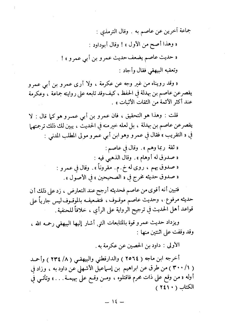 وتعقبه البيهقى فقال ـ وأجاد ـ: " وقد رويناه من غير وجه عن عكرمة , ولا أرى عمرو بن أبى عمرو يقصر عن عاصم ابن بهدلة فى الحفظ , كيف وقد تابعه على روايته جماعة , وعكرمة عند أكثر الأئمة من الثقات الأثبات ".