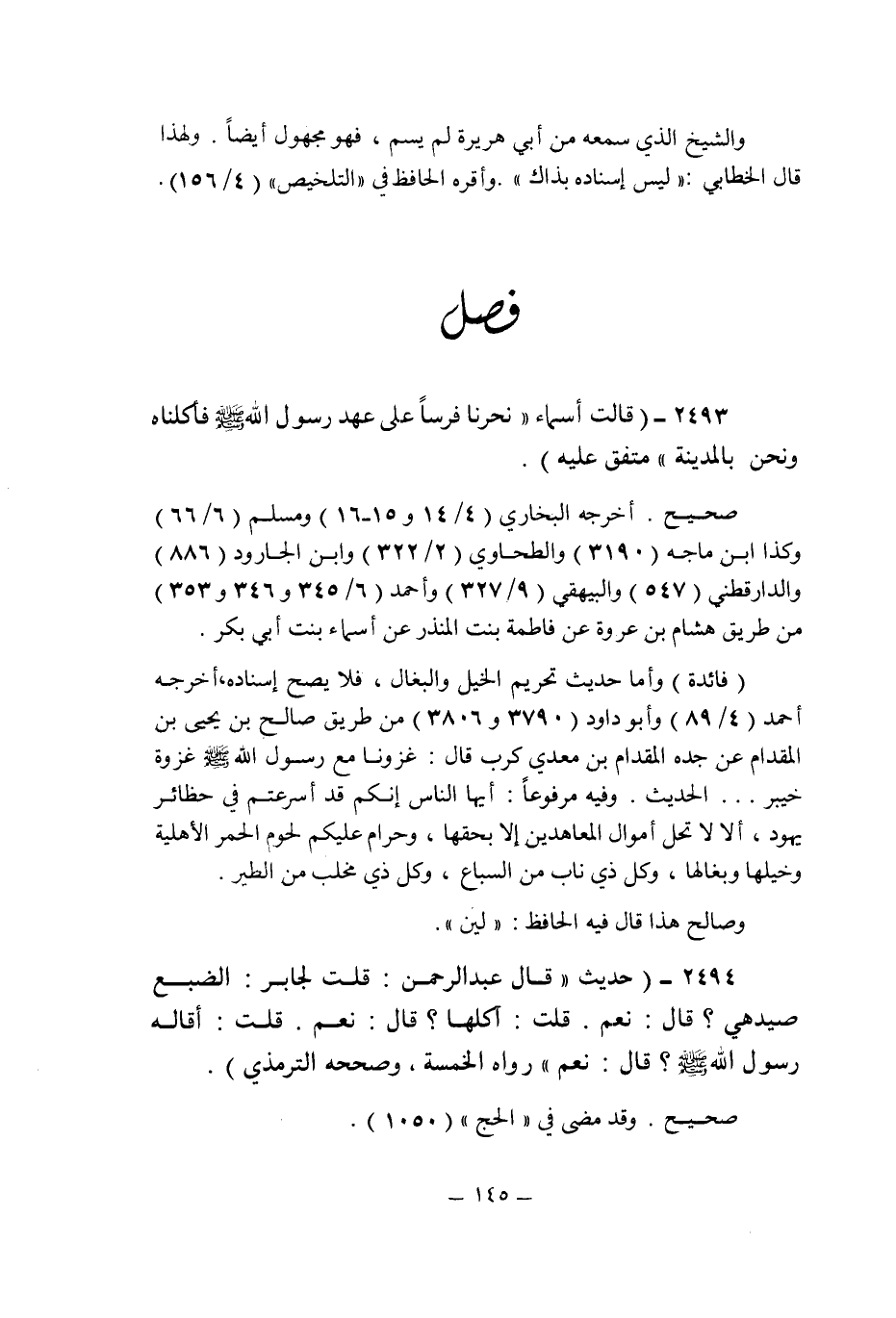 (2493) - (قالت أسماء: " نحرنا فرسا على عهد رسول الله صلى الله عليه وسلم فأكلناه ونحن بالمدينة " متفق عليه.