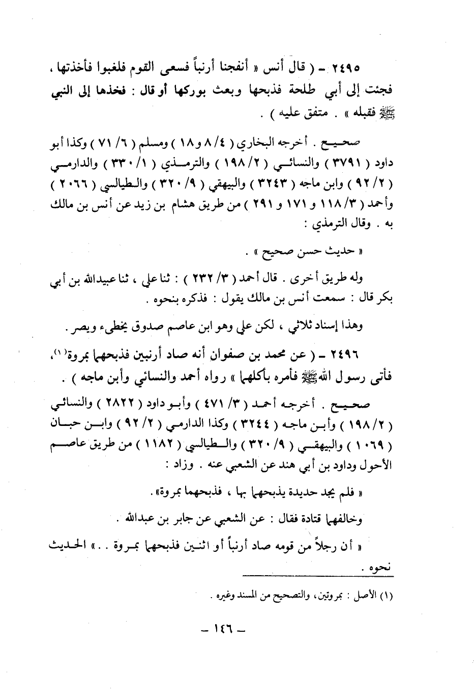 (2496) - (عن محمد بن صفوان: " أنه صاد أرنبين فذبحهما بمروة (1) فأتى رسول الله صلى الله عليه وسلم فأمره بأكلهما " رواه أحمد والنسائى وابن ماجه.