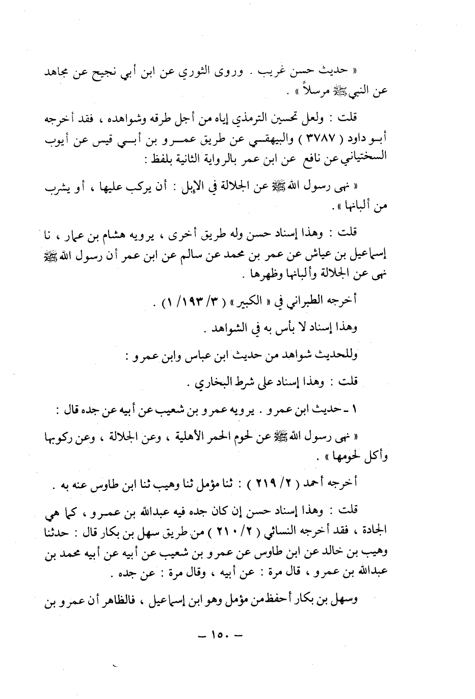 قلت: ولعل تحسين الترمذى إياه من أجل طرقه وشواهده , فقد أخرجه أبو داود (3787) والبيهقى عن طريق عمرو بن أبى قيس عن أيوب السختيانى عن نافع عن ابن عمر بالرواية الثانية بلفظ: " نهى رسول الله صلى الله عليه وسلم عن الجلالة فى الإبل: أن يركب عليها , أو يشرب من ألبانها ".