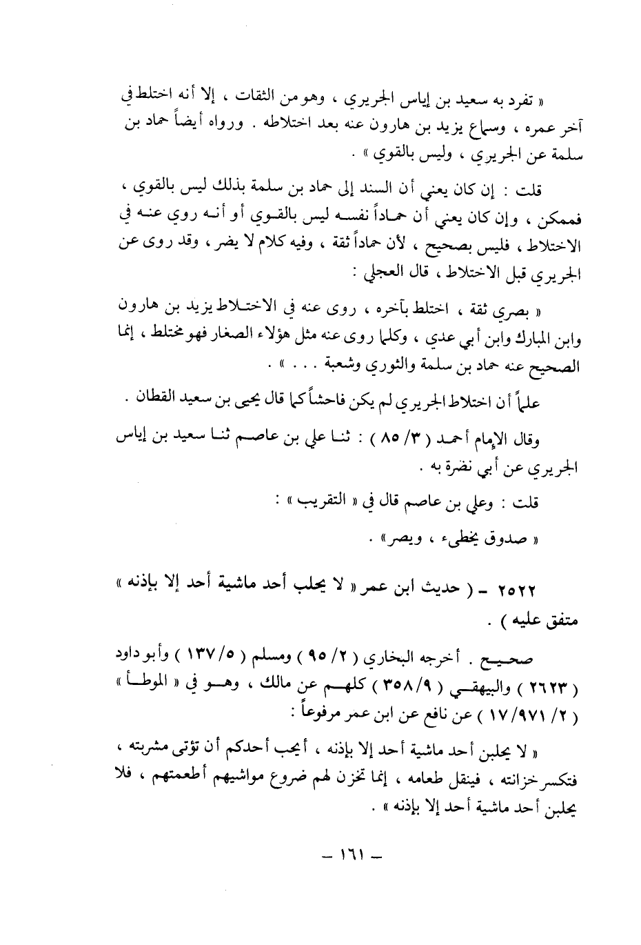 قلت: إن كان يعنى أن السند إلى حماد بن سلمة بذلك ليس بالقوى , فممكن وإن كان يعنى أن حمادا نفسه ليس بالقوى أو أنه روى عنه فى الاختلاط , فليس بصحيح , لأن حمادا ثقة , وفيه كلام لا يضر , وقد روى عن الجريرى قبل الاختلاط , قال العجلى: " بصرى ثقة , اختلط بآخره , روى عنه فى الاختلاط يزيد بن هارون وابن المبارك وابن أبى عدى , وكلما روى عنه مثل هؤلاء الصغار فهو مختلط , إنما الصحيح عنه حماد بن سلمة والثورى وشعبة ... ".