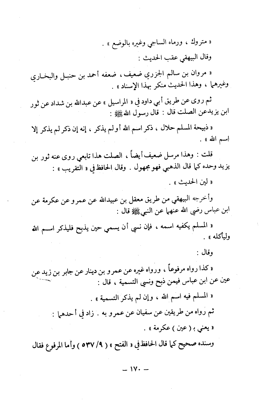 وقال الحافظ فى " التقريب ": " لين الحديث " وأخرجه البيهقى من طريق معقل بن عبيد الله عن عمرو عن عكرمة عن ابن عباس رضى الله عنهما عن النبى صلى الله عليه وسلم قال: " المسلم يكفيه اسمه , فإن نسى أن يسمى حين يذبح فليذكر اسم الله وليأكله ".