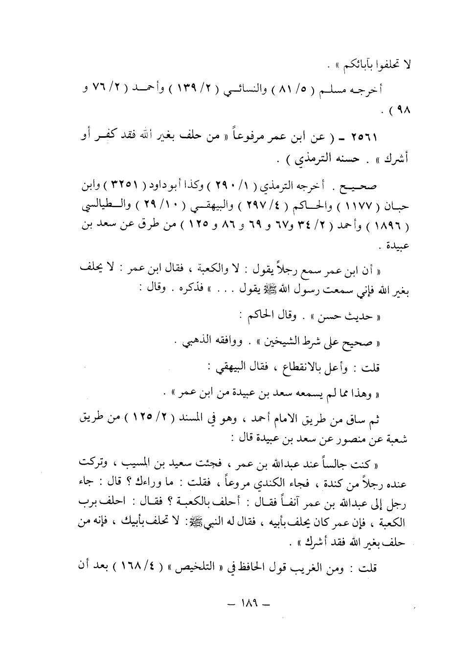 ثم ساق من طريق الإمام أحمد , وهو فى المسند (2/125) من طريق شعبة عن منصور عن سعد بن عبيدة قال: " كنت جالسا عند عبد الله بن عمر , فجئت سعيد بن المسيب , وتركت عنده رجلا من كندة , فجاء الكندى مروعا , فقلت: ما وراءك؟ قال: جاء رجل إلى عبد الله بن عمر آنفا فقال: أحلف بالكعبة؟ فقال: احلف برب الكعبة , فإن عمر كان يحلف بأبيه , فقال له النبى صلى الله عليه وسلم: لا تحلف بأبيك , فإنه من حلف بغير الله فقد أشرك ".