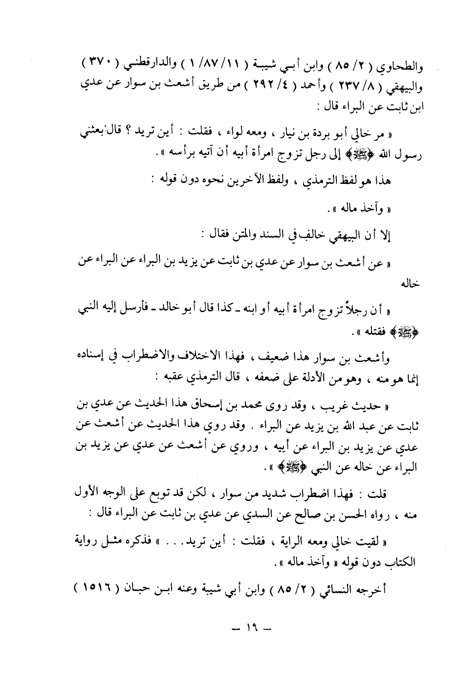 والطحاوى (2/85) وابن أبى شيبة (11/87/1) والدارقطنى (370) والبيهقى (8/237) وأحمد (4/292) من طريق أشعث بن سوار عن عدى بن ثابت عن البراء قال: " مر خالى أبو بردة بن نيار , ومعه لواء , فقلت: أين تريد؟ قال: بعثنى رسول الله صلى الله عليه وسلم إلى رجل تزوج امرأة أبيه أن آتيه برأسه ".
